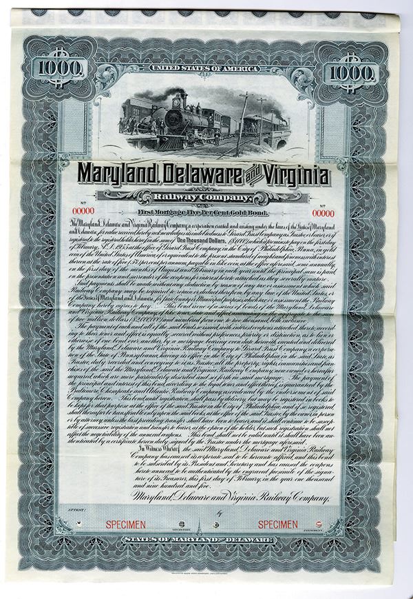 Maryland & Delaware. $1000 Specimen 5% 1st Mortgage Gold Coupon Bond, Black print on blue/gray border and under tint, Locomotive s at station at top, Specimen overprints and POC's, VF-XF condition, ABNC.