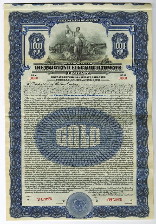 Maryland. $1000 Specimen 6 1/2% Series A 1st and Refunding Mortgage Gold Coupon Bond, Black print on blue border and under tint, Allegorical bare breasted woman at top in rail yard, Specimen overprints and POC's, VF-XF condition, ABNC.