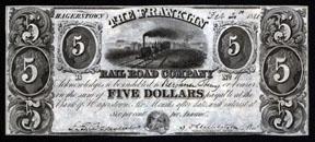 Hagerstown, MD. 1841. $5. Issued and uncancelled. Black on white paper. Locomotive right to left with cameo Roman soldiers flanking vignette, end panels with cameo woman and denomination on left and right and small dog on bottom. Crisp XF+ to AU. Scarce and attractive note especially in high grade. UBS&H-DU&C. Imprint.