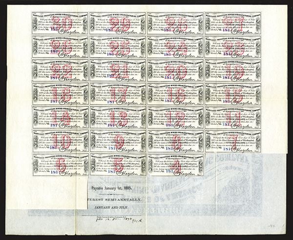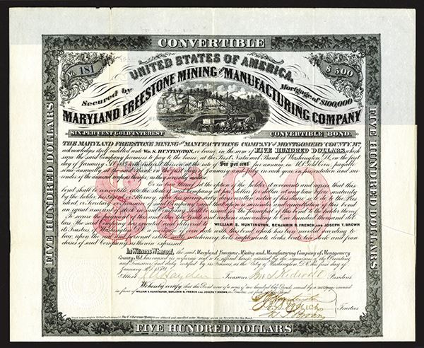 Maryland (Inc. in Washington, D.C.). $500 I/U 6% Gold Coupon Bond, Black on red underprint, Horse passing quarry under title, Fine to VF, Scarce early mining company.