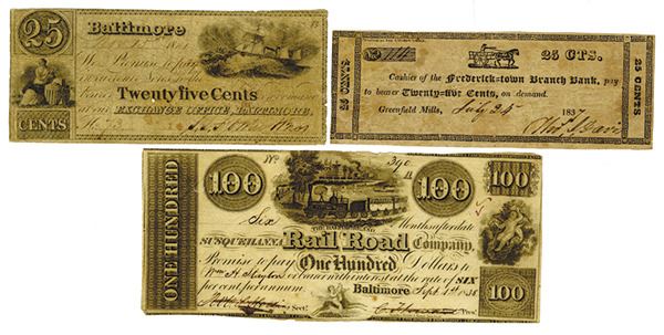 Maryland, Lot of 3 notes, Includes 1837 Frederick=town Branch Bank, 25cts, I/U, VF with very small pin holes or natural holes in paper; 1838, $100 Baltimore and Susquehanna Rail Road Co., VF and 1841, 25cts, Exchange Office Baltimore, VG. (3)