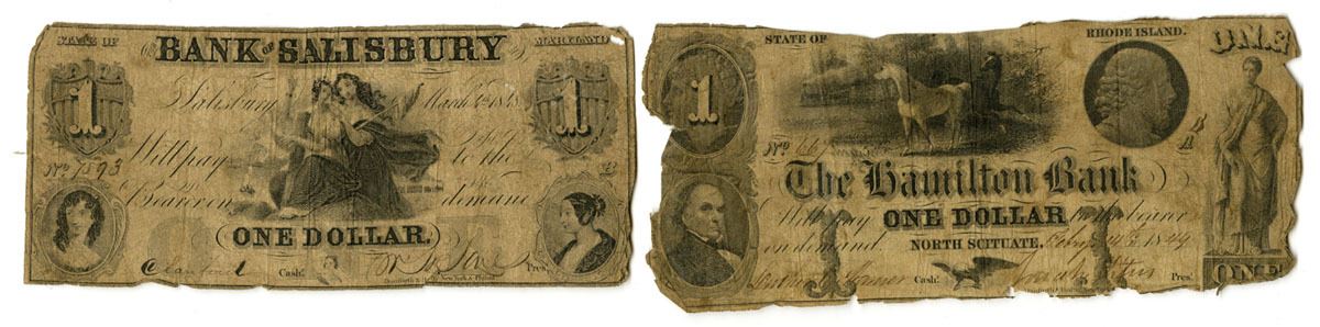 Maryland & Rhode Island, 1848-49. Lot of 2 Issued Banknotes, Includes: 1848, Bank of Salisbury, $1, I/U Banknote S/N 7593; 1849, Hamilton Bank, $1, I/U Banknote, SD/N 667. Notes are in Very Good with edge problems to Fine condition. (2). Sold "AS IS" no returns accepted.