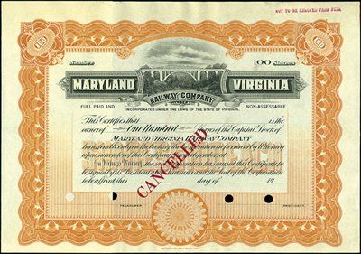 VA, MD. 19--(ca. 1900-1920). Specimen. 100 shs. Common Stock, orange. Vignette of railroad bridge over valley with no train on it. Unlisted railroad in Cox. SBNC. XF.