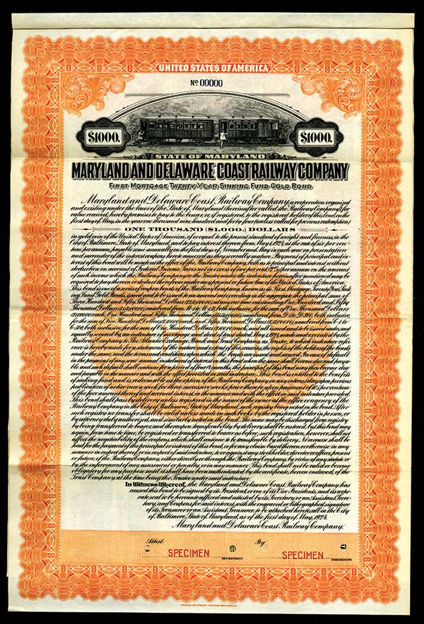 Maryland and Delaware Coast Railway Co., Specimen Bond. Maryland, 1924, $1000 Specimen 1st Mortgage 6% Specimen Gold Coupon Bond, Black on orange border and underprint, interurban railroad on top with people boarding, POC's, red SPECIMEN overprint and red s/n "00000", VF condition, FLD-ABNC. Listed railroad but unlisted bond in Cox.
