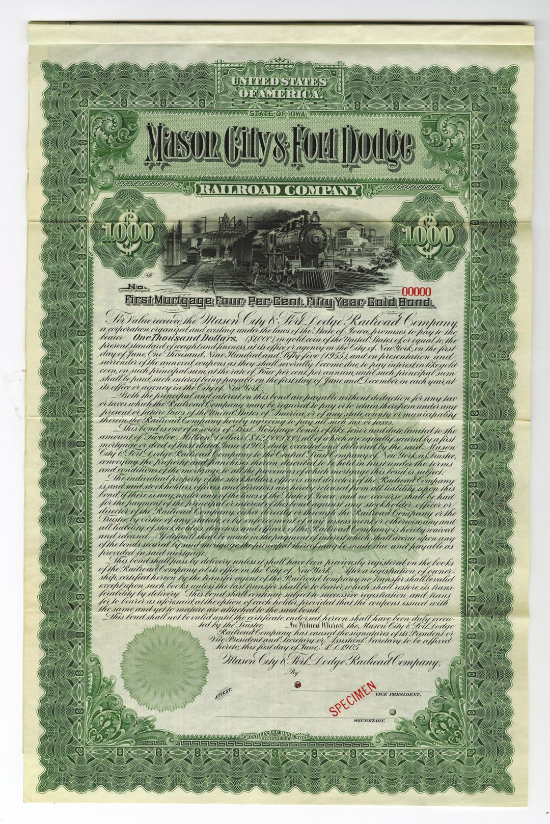 Iowa. $1000 1st Mortgage 4% 50 Year Gold Coupon Bond. Green border and undertint. Locomotive in train yard with men watching. XF condition. Red specimen overprint and POC's. FL-BNC. Rare and attractive bond only known as a specimen in Cox with only 4 found in the ABN archives.