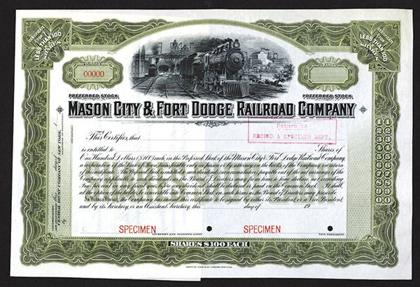 Iowa. <100 Shares, preferred, Black on olive green, Locomotive under signal towers with workers next to train, unlisted later design and type in Cox. Rare and attractive. ABNC.