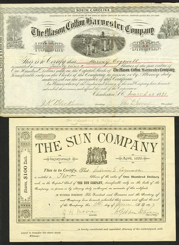 Charleston, S.C., 29 Shares, I/U, Unique vignette of man on mule pulled harvesting machine. Also includes 1897, S.C., Sun Company stock certificate. . Both in Fine to VF condition.