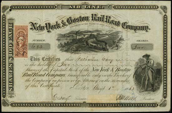 This railroad was chartered in Connecticut, Rhode Island and Massachusetts. Issued and uncancelled stock certificate. 1863. 2 Shares. Black border, title, text and vignette, no undertint.Vignette of locomotive going by factory and river with steamboat in middle and male reaper on lower right. XF condition. 2 different 25 cent 1st issue U.S. revenue stamps on face and back. G.Baldwin, NY was the printer. Scarce certificate.