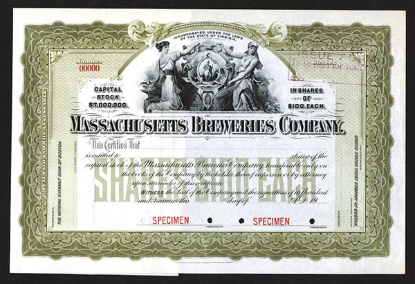 MA. Odd Shares, Specimen Black on olive green, Allegorical women flank Massachusetts arms, POC's, VF, rare brewery certificate. ABNC.