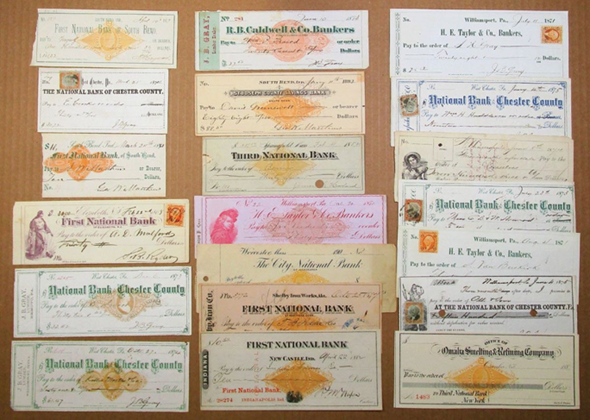 Massachusetts, Pennsylvania, and Indiana. 1868-82. Lot of 15+ Issued Checks from Various National Banks with Revenue Stamps or Imprinted Revenues, Fine to VF condition. (20).