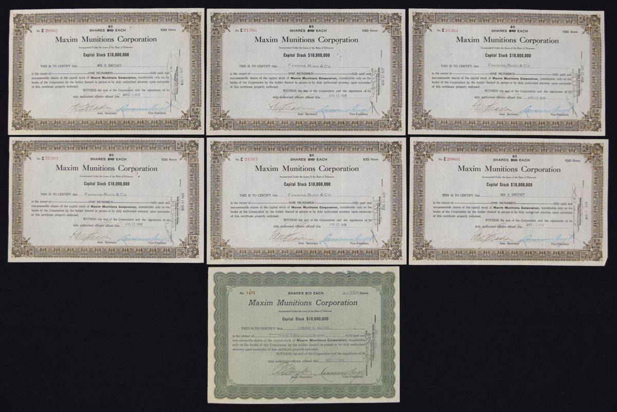 Delaware...., 1915-18. Lot of 6 I/U Stock Certificates, Includes: 1000 Shares Capital Stock Certificate, Black on green border and underprint, 1915; 100 Shares Capital Stock Certificate, Black on brown border, 1918 (5). Certificates range from Choice Fine to VF condition. (6) Sold "AS IS" no returns accepted. (ex. John E. Herzog Collection)