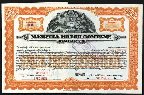 <100 Shares, Specimen Stock, Black on orange border, Specimen overprints and POC's, VF condition, Scarce early automobile stock certificate. ABNC.