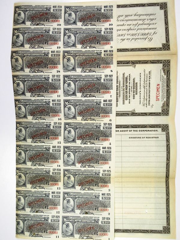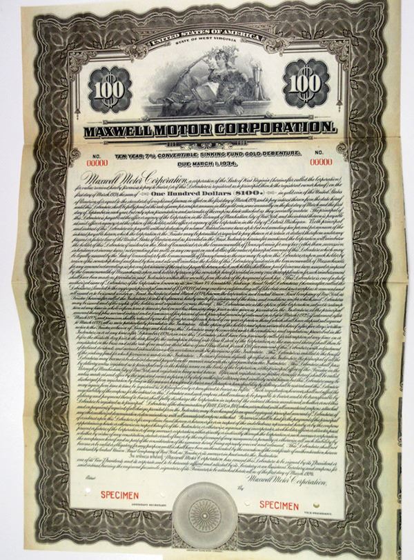 Detroit, Michigan, 1924, $100, Specimen, 7 % Convertible Sinking Fund Gold Bond. Black with brown border and underprint, Warrior woman hugging resting lion, Coupons attached. Red specimen overprints, POC's and "00000" serial numbers. XF condition. Historic automobile bond issued right after the company released the first Chrysler automobile. It was during the early 1920s that Walter Chrysler assumed the presidency of Maxwell. In January 1924, Walter Chrysler launched the well-received Chrysler automobile at Maxwell Motors. The Chrysler Corporation was founded by Walter Chrysler on June 6, 1925, when the Maxwell Motor Company was re-organized. Following the introduction of the Chrysler, the Maxwell was dropped after its 1925 model year run, although the new line of lower-priced 4-cylinder Chryslers which were then introduced for the 1926 model year were basically Maxwell's which had been re-engineered and rebranded. ABNC. Rare automobile bond.