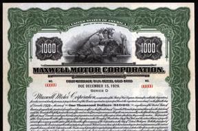 West Virginia, 1924, $1,000. 5.5% first mortgage serial gold bond, Series D, Green border and underprint with allegorical woman reclining on lion. ABNCo. Specimen w/coupons, XF, In 1913, the Maxwell assets were purchased by Walter Flanders, who reorganized the company as the Maxwell Motor Company, Inc.. The company moved to Detroit, Michigan. Some of the Maxwells were also manufactured at a plant in Dayton, Ohio. Maxwell was considered one of the three top automobile firms in America along with Buick and the Ford. By 1914, Maxwell had sold 60,000 cars. Rare specimen bond from this famous auto maker.