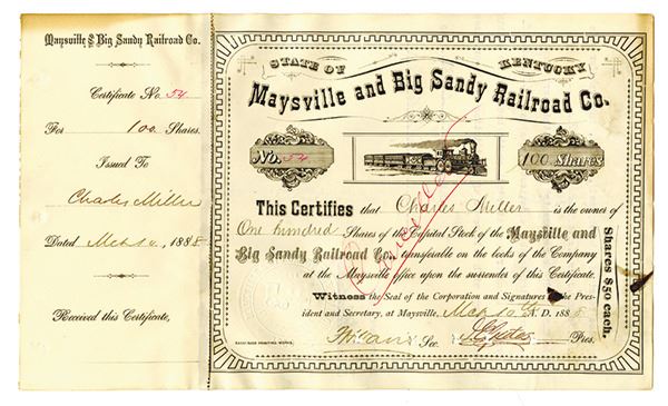 Kentucky. 100 Shares Capital Stock Issued Certificate, Black print on black border, Drawing of locomotive at center, Low serial number-54, Hand written cancelled across face and POC's along bottom, Fine-VF condition with minor toning condition, Excelsior Printing Works.
