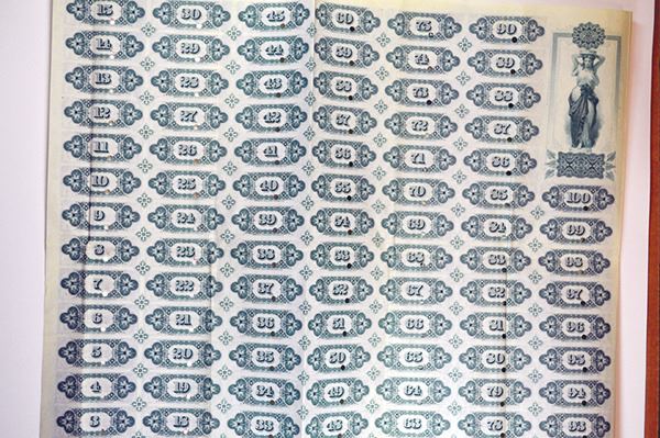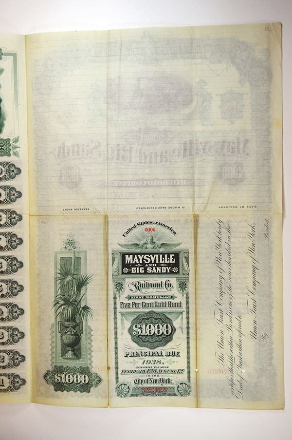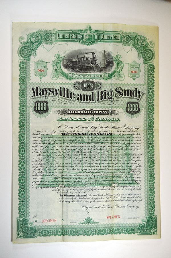 Kentucky, Specimen $1000 Consolidated 1st Mortgage 5% Gold Coupon Bond, Black on green border and undertint, locomotive L-R passing telegraph wires, Fine to VF, Specimen overprint, POC's. ABNC. Unlisted as a bond in Cox. Only 2 found in the archives 12 years ago and this is the only one available. Rarely do you find railroad bonds that are full color and are this attractive.