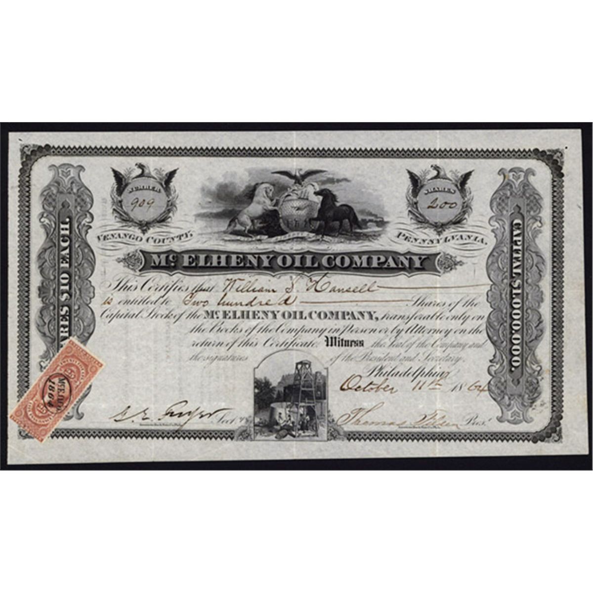 Venango County, Pennsylvania, 1864, 200 Shs, Issued and uncancelled stock. Arms of Pennsylvania on top and men with Oil wells and barrels on bottom. Revenue stamp on left (25 ct Life Insurance, 1st Issue, perf with great oval cancel). XF condition with one pin hole on upper left corner. Scarce ABNC oil stock.