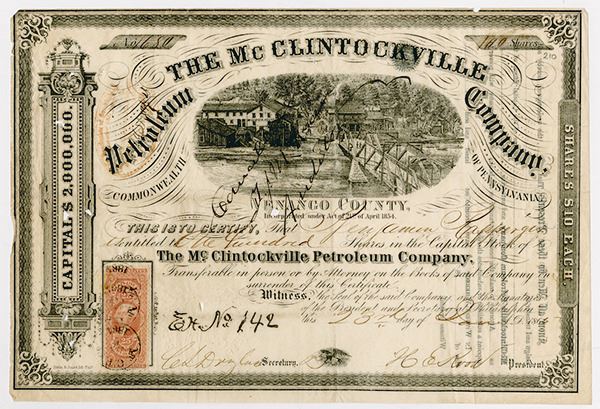 Pennsylvania. 100 Shares Capital Stock Issued and Cancelled Certificate, Black print on simple black border, Small image of refinery and storage buildings at top, Hand written cancelled over certificate, VF-XF condition, Stein & Jones Lith.