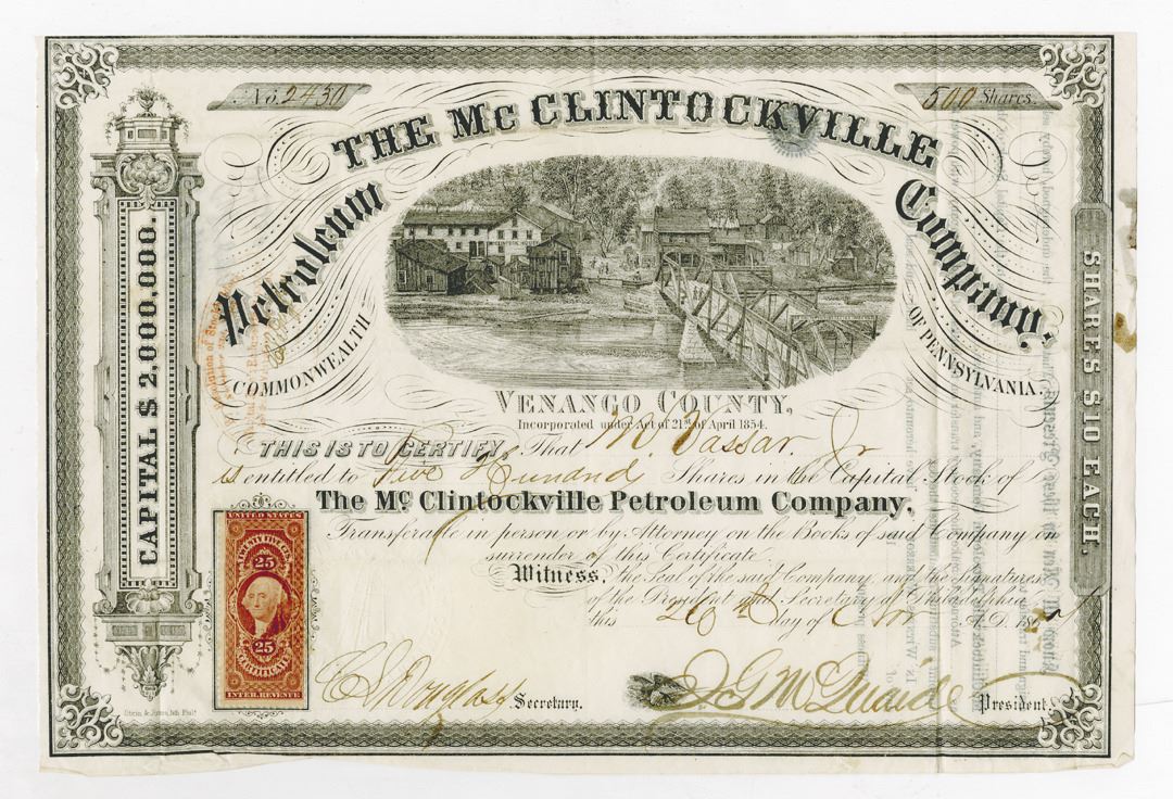 Venango County, PennsylvaniaÉ... 500 Shares Capital Stock I/U Certificate, Black print on black border, Scene of bridge over water at top with "McClintock House" in view in background, VF-XF condition. Stern & Jones Lith.