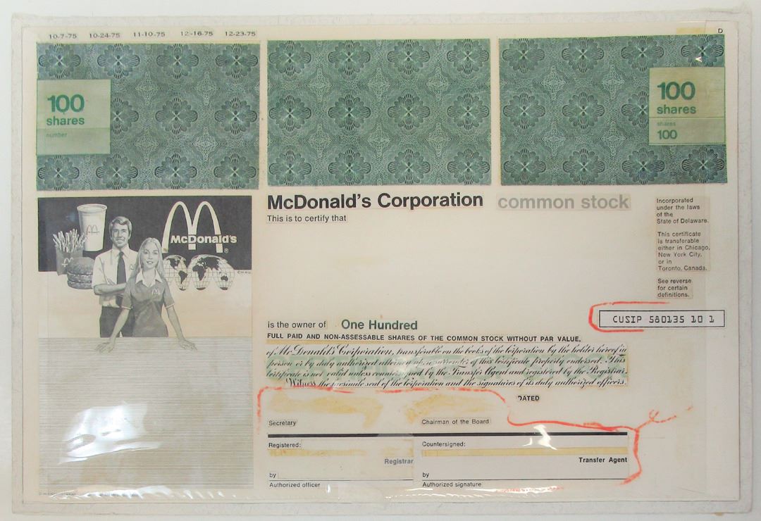 Delaware, 1975. 100 Shares Production design mockup Stock Certificate, Black text with green border and underprint, McDonald's logo and employees at left. Includes stock certificate elements pasted on thick cardstock, protected by plastic. Some additional elements and approval stamp on back. Fine-VF condition, SC-USBN. McDonald's Corporation is an American fast food company, founded in 1940 as a restaurant operated by Richard and Maurice McDonald, in San Bernardino, California, United States. Unique format for this very early version of their stock certificate.