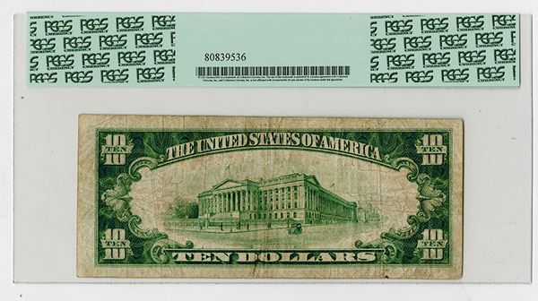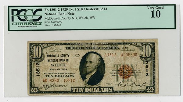 U.S. National Bank Note, $10, Charter #13512, PCGS VG 10 but appears better. S/N A006390. 43 Small type known on this bank with only 4 $10 T2 notes known.