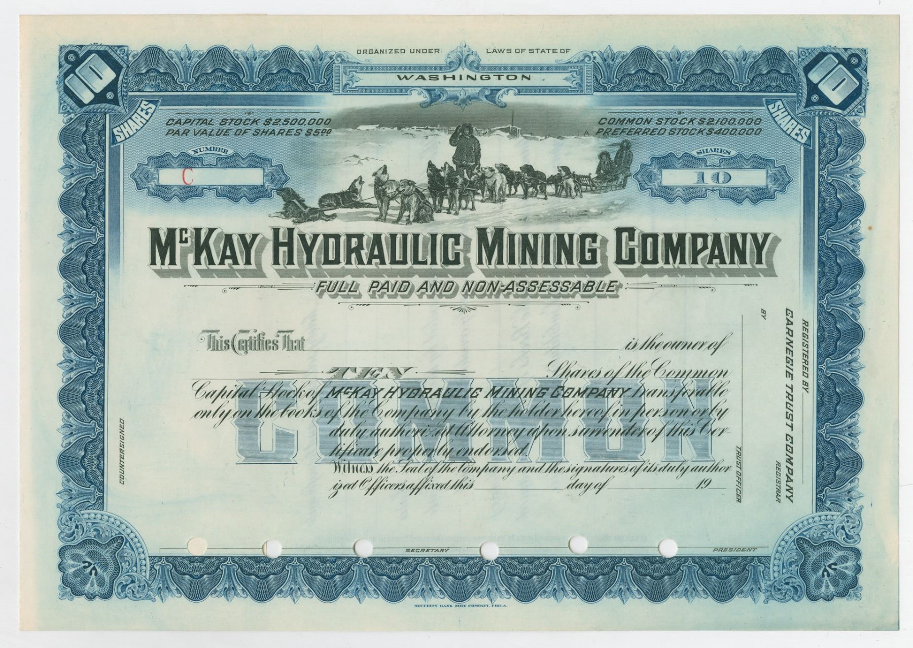 Alaska (Inc. in Washington). 10 Shares Common Stock Specimen Certificate, Black print on blue border and under tint, Eskimos and sled dogs at top, POC's at bottom, VF-XF condition, SBNC. This is probably the only stock certificate with an attractive and realistic dog sled team. Rare Alaska mining stock. Only 3 were found in the ABN Archives in 2005.