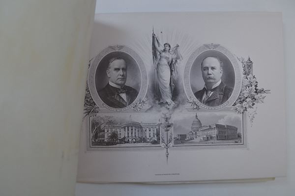 Washington, D.C., March 4th, 1897, three different Bureau of Engraving and Printing cards with cover by Baily, Banks & Biddle. Front cover with ornate building and close up of the ball, back cover U.S. flag, inner BEP engraved cards include McKinley and Hobart portraits flanking allegorical Liberty in middle over the White House and U.S. Capital on bottom; a second page of a list of everyone on the committee and the third page with eagle and shield flanked by Ohio and New Jersey arms. Original ribbon tying the booklet together, XF condition with thin protective paper over each page. BEP.