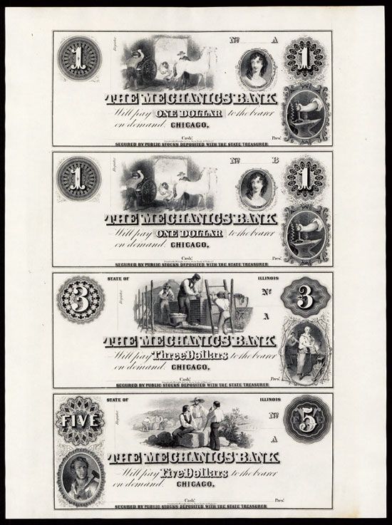 Chicago, Illinois, Uncut sheet of 4 notes, ND (originally printed ca. 1840-50's, these are ca.1960-70's), $1-$1-$3-$5, (Haxby Unlisted), Haxby has no mention of any notes from Chicago with this bank name or designs, evidently better than SENC, Modern ÒProprietary Proof SheetÓ, The $1 note has blacksmith putting on horse shoes on an unhappy horse with partner at the forge hammering, young ladys portrait to right and arm and hammer with anvil on LR, no registration seal is present on any of the denominations and was evidently going to be placed afterwards in a different color; the $3 note has masons laying brick in middle with what looks like a female blacksmith on the LR; the $5 note has blacksmith with hammer at left and men standing by railroad tracks in middle speaking, Black printing without underprint printed on thin white card, Appears Choice Uncirculated condition but the paper is wavy on the top and the bottom . ABNC. Rare and possibly unique sheet from the ABN Commemorative archive, Rare as uncut sheet. (ABN Commemoratives, AIA XI, May 15, 2012)