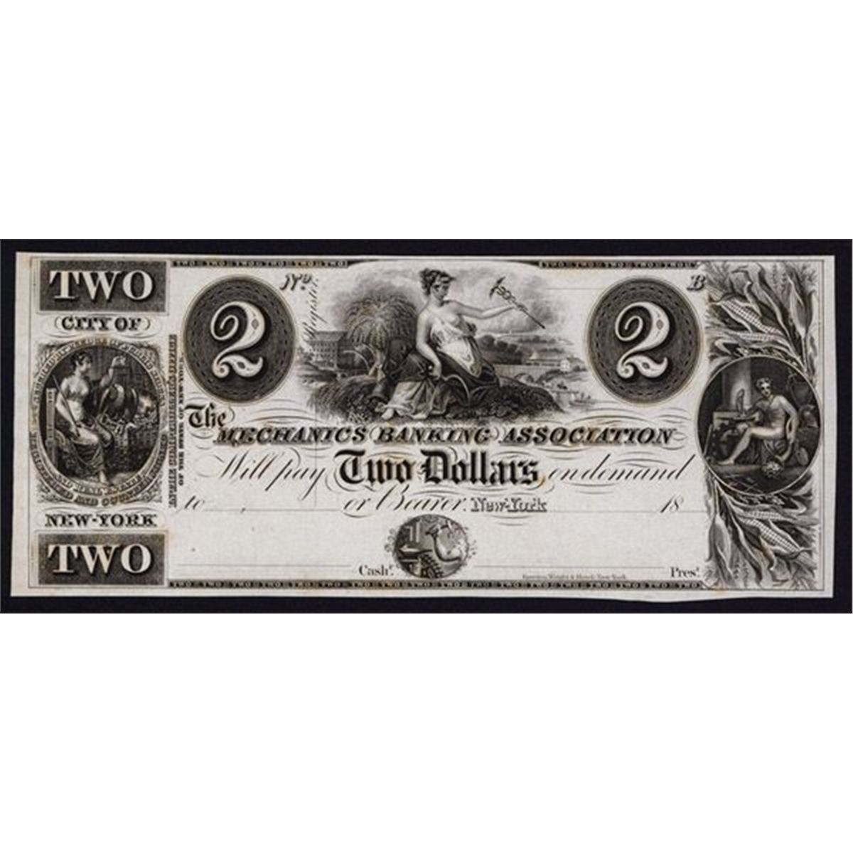 New York, New York, 18xx (ca.1830's), $2, Plate B, NY-1725-G6, SENC, Unlisted in census, Proof banknote, Banknote printed in black on india paper, Allegorical woman with sheaves, cadaceaus, small train and factories in background in middle, seated young man with cornucopia and hammer on right, State die on left, arm and hammer on bottom, Choice to Gem Uncirculated condition, Rawdon, Wright & Hatch, New York imprint. (Silver City Collection, Part 2)