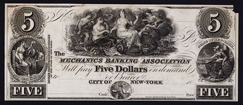 New York, New York, 18xx (ca.1830's), $5, Plate A, NY-1725-G12, SENC, Unlisted in census, Proof banknote, Banknote printed in black on india paper, Allegorical woman and lion with Mercury and other figures in middle, State die on left and Minerva with shield and small owl at right, Impaired Proof in Uncirculated condition with the top right corner tip missing , otherwise it would have graded Choice Uncirculated, Rawdon, Wright & Hatch, New York imprint. (Silver City Collection, Part 2)