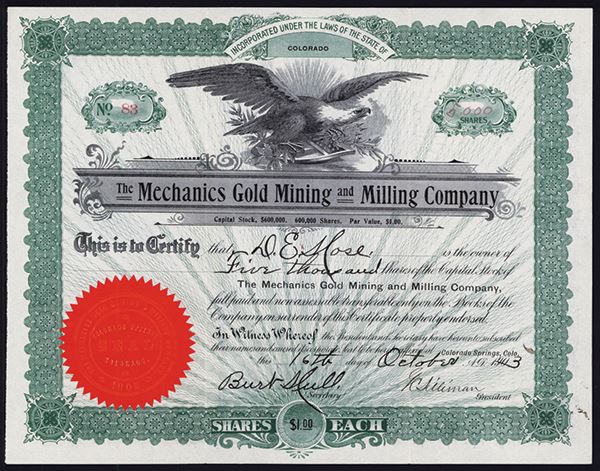 Colorado Springs, Colorado, 1903, 5000 Shares, I/UC, Black on green, Patriotic eagle and shield on top of title, red seal, Cert.#83, XF condition. Scarce Colorado mining stock.