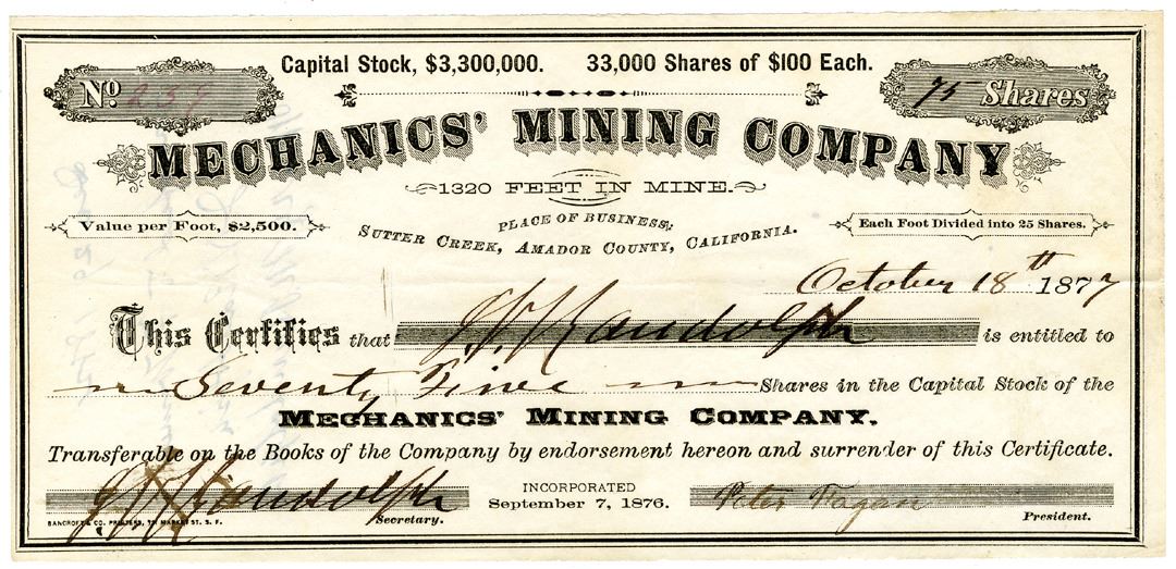 Sutter Creek, Amador County, CA. 1877, 75 Shares, I/U Stock Certificate, Ornate text, no vignette, S/N 239, "Value per Foot $2500 - Each foot divided into 25 Shares", VF. The mine was located where gold was originally discovered in California starting the gold rush.