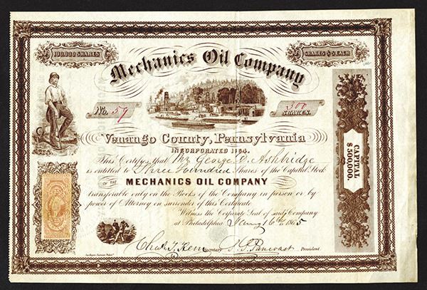 Venango County, Pennsylvania. 300 Shares, I/U, dark brown without underprint, Oil working standing at left, men working on lower left, oil tanks and barges in middle, S/N 59, U.S.I.R. revenue stamp at lower left with corporate seal, VF to XF condition, rare oil certificate. Jas. Hogan, Philad.