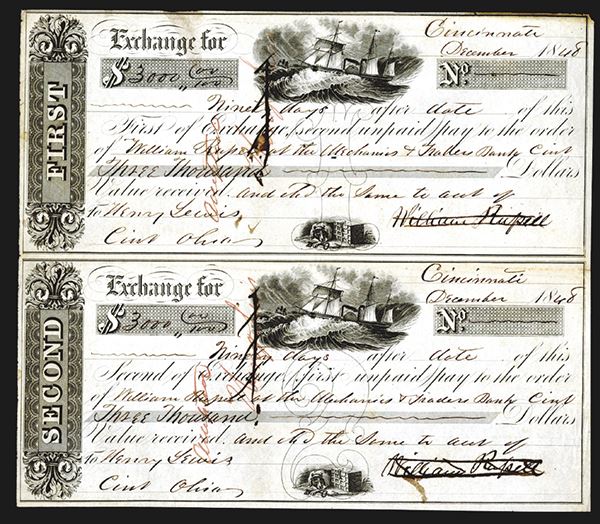 Cincinnati OH Mechanics & Traders Bank. First and Second Exchange notes attached. 1848. Cancelled. Folded between notes, tone at top, ink stain on back. VF+