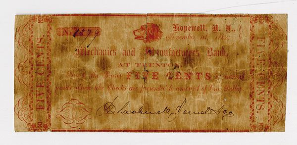 Hopewell, NJ. 5 cents, 1862, Wait Unlisted, Probably R-7. Blackwell Jewett & Co. issued scrip in the 1860s. This issued 5ct piece is printed in red on one side only, with a small dog's head central vignette. It is similar to Wait 828, which is a 25c scrip(R-7) from the same issuer. VG, toned splits, but rare.