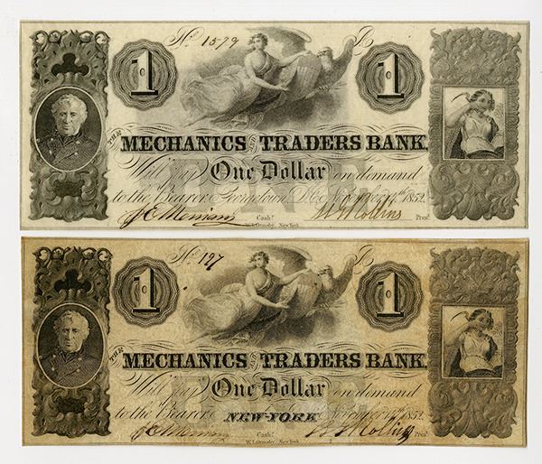 Georgetown, DC. And New York, NY. Lot of 2 notes with the same design. The DC note is genuine, but issued by a fraudulent bank, AU condition. The NY note is altered from the DC note. W.L.Ormsby. (2)