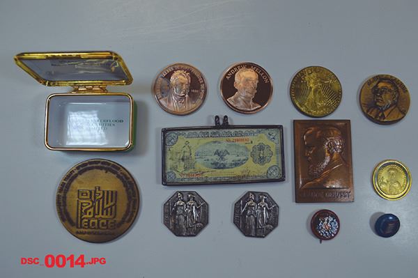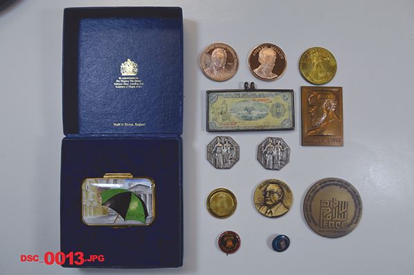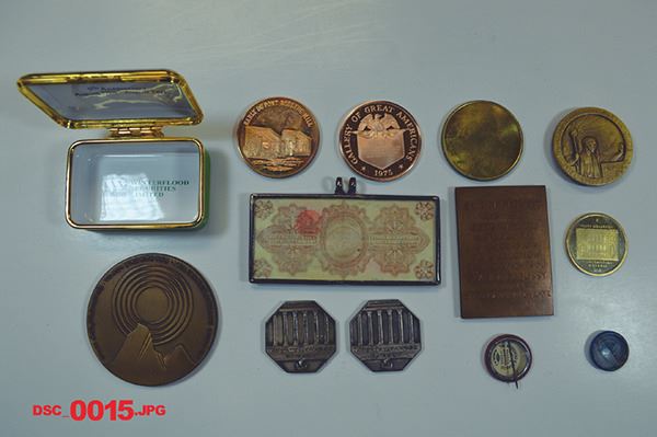 Lot of 13 items, Includes 2 Liberty Loan pin backs, ca. 1914-1918; a 1993 Commemorative Halcyon Days Enamel Box for Winterflood Securities; a glass enclosed Mexican banknote incased in glass with a silver border; 2 silver Paris Stock Exchange medals; and additional modern medals. Mostly VF to Uncirculated.
