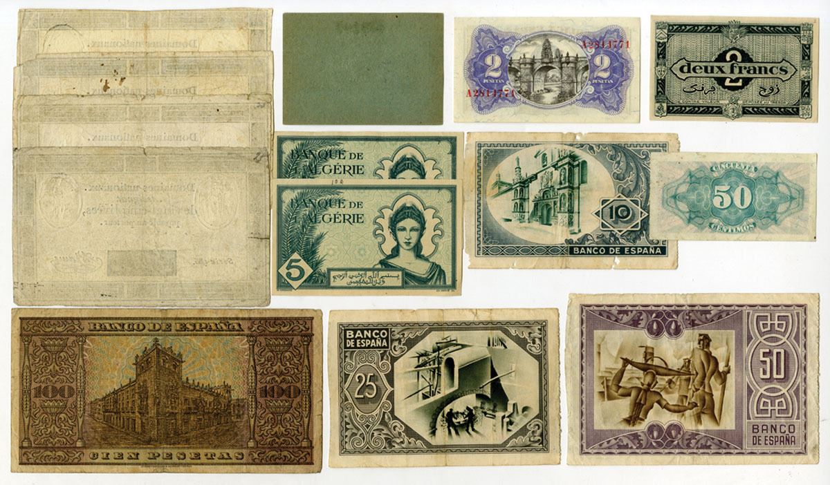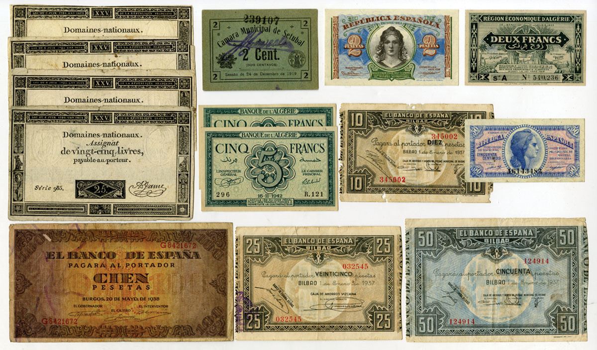 Algeria, France, Greece, Portugal, Spain, 1919-73. Lot of 17 Issued Banknotes, Highlights Includes: Banque de l'Algeria, 1942-44, 5 Francs, P-91 (2); 2 Francs, P-99a; Domaines Nationaux, 1973, 25 Livres, P-A71 (4); Camara Municipal de Setubal, 1919, 2 Centavos, P-Unlisted, Private Local Issue; Ministry of Finance, 1937-38, 50 Centimos, P-93; 2 Pesetas, P-95; Banco de Espana. 1938. 100 Pesetas, P-113a; 10 Pesetas, P-S562; 25 Pesetas, P-S563; 50 Pesetas, P-S564. Lot also includes banknotes from Greece. Notes range from Fine to VF+ condition. (17). Sold "AS IS" no returns accepted.