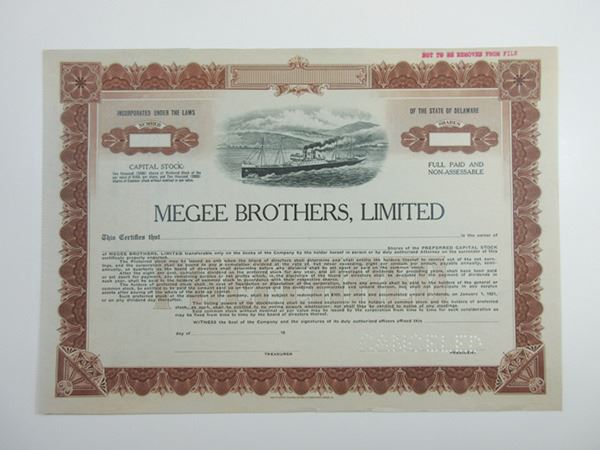Delaware. Odd Shares Preferred Capital Stock Specimen Certificate, Black print on brown border and under tint, Steamship out on water at top, Pin punched cancelled, VF-XF condition, SBNC.