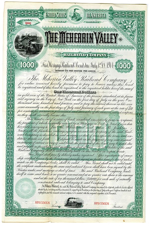 Virginia, 1884. $1000 Specimen 6% First Mortgage Railroad Bond, Black text with green border and undertint, Train exiting busy station in circular frame at top left corner. Red specimen overprints, 0000 serial number, POCs, Fine condition with toning along vertical fold lines, some splitting along fold lines as well. ABNC. Unlisted design in Cox. This was the only example in the ABN Archives in 2002. This is it.