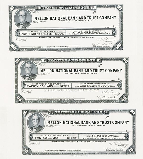 Pittsburgh, Pennsylvania, ND (ca. 1930-40), Three Large Die Proofs without underprint for $10, $20 and $100 denominations in black on slightly glossy paper, AU to Uncirculated condition, SBNC.