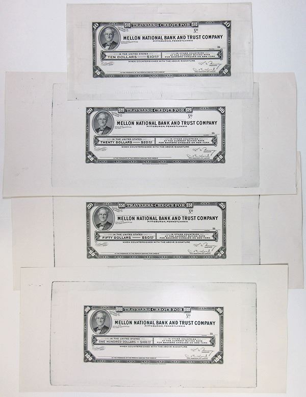 Pittsburgh, Pennsylvania, 19xx (ca.1920-30's). Lot of 4 different Traveler's Check proofs. Includes $10, $20, and $50 and $100 denominations. Black print. Portrait of Judge Thomas Mellon on left of each check. All have extra margin on all sides. Staple holes as used in archive. AU condition. Attractive and scarce group of Traveler's Checks. SBNC.