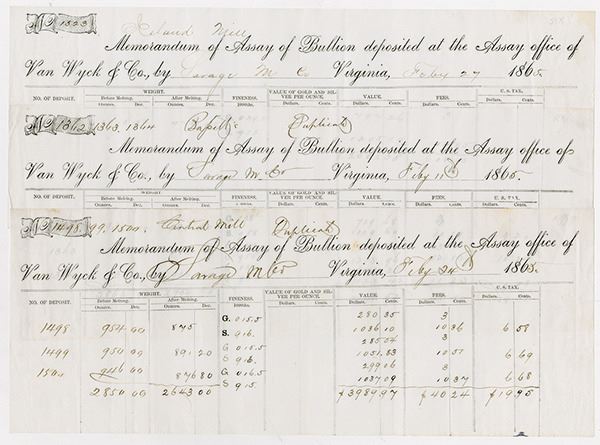 Virginia, Nevada. 1865. Lot of 2 different issued Bullion Assay Receipts for the Savage Mining company from 2 different mills related to different mining locations with detailed analysis, quantity and value of gold and silver content of ore produced at these mills. Savage Mining Company was incorporated in 1862. Scarce assay receipts. Both in XF condition.