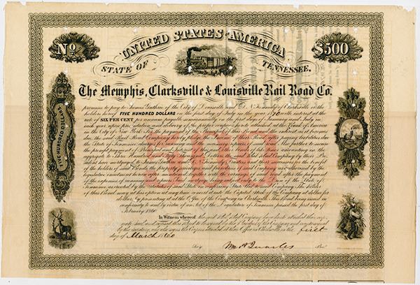 Tennessee. $500, bond, train r-l plus three vignettes, horizontal format, handwritten redemption date, mortgage, large horizontal format, bearer coupon, 6%, 1860, by Mid&W.