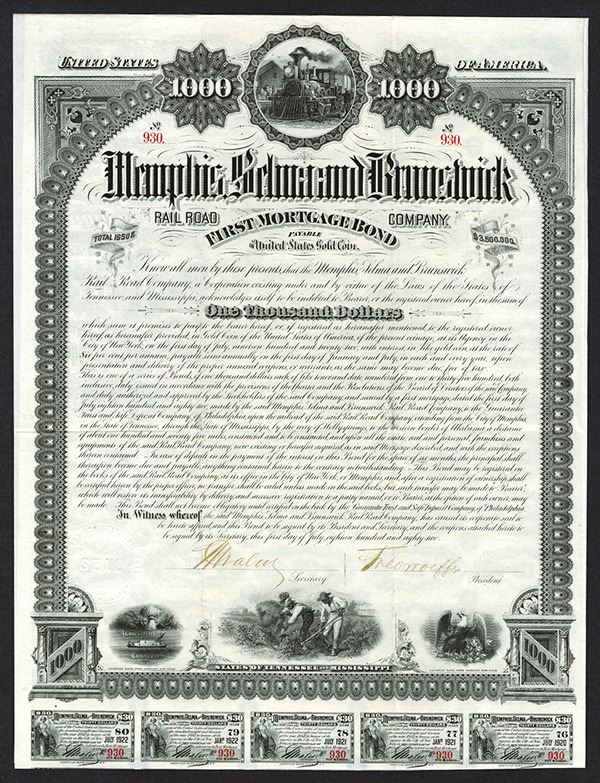 Tennessee and Mississippi, $1000, 6% 1stMortgage Specimen Bond, VF condition, ABNC.