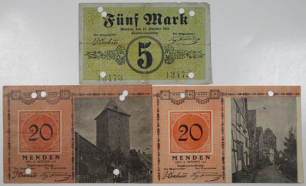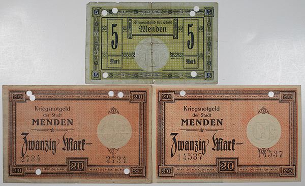 Germany. Lot of 3 notes, includes a 5 Mark and a pair of 20 Mark Notgeld, all different designs, and with multiple POCs. Fine to VF. (3)