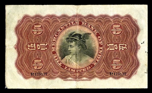 Hong Kong, 29th November, 1941, $5. P-235d, Issued Banknote, Olive green on m/c underprint, boats at center with buildings and tower behind, back dark red and black, 2 Serial Numbers on back, S/N 175127, PMG graded Very Fine 30, Amazing note the appears Choice VF to XF condition, large even margins, bright colors and excellent paper body enhance this lovely note that has a purple ink mark on the top right corner as the only distraction. W&S.