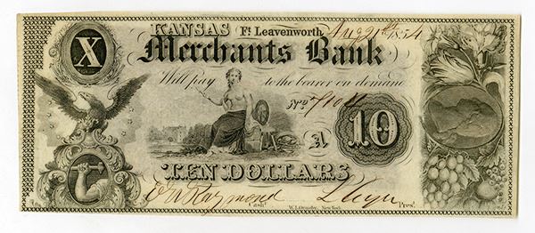 Ft. Leavenworth, KS. $10, Haxby KS-35-G8, AU to Choice AU condition. This is a genuine note from a fraudulent bank. W.L. Ormsby, NY.