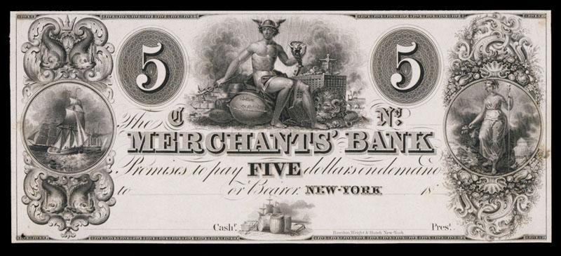 Merchants' Bank, ca.1830's Obsolete Proof.New York, NY, 18xx (ca.1830's), $5, Plate C, Proof banknote, NY-1745-G48, Unlisted in census, Banknote printed in black on india paper, Seated Mercury holding cornucopia with lion on top middle, sailing ships on left and allegorical young woman on right, Glue stains in corners, AU condition note. Rawdon, Wright & Hatch, New York imprint. (Silver City Collection, Part 1)