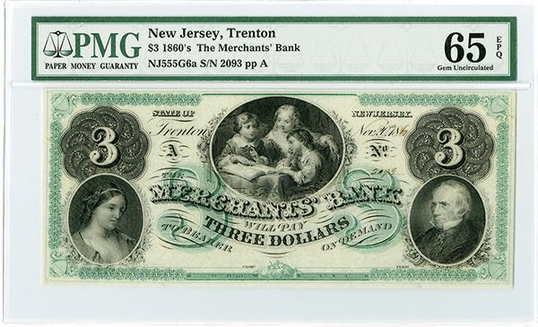 Trenton, New Jersey, $3, NJ-555-G6a, Remainder obsolete banknote, Black on green border and underprint, S/N 2093 pp A, PMG graded Gem Uncirculated 65 EPQ. Attractive note.